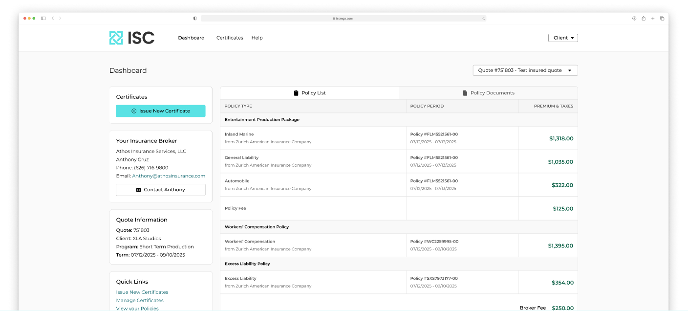 ISC Entertainment manages 30 insurance programs for 9 insurance companies through our proprietary online platform that allows retail brokers to transact specialty products in real time.